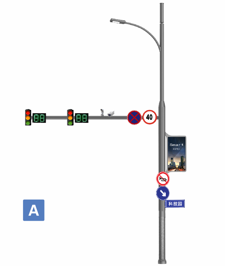 青島交通綜合桿的設計和功能具有顯著的獨特性,主要體現在以下幾個方面: ?多功能集成?:青島交通綜合桿實現了“多桿合一”的設計理念,將路燈、交通設施桿、路名牌、導向牌與各類設施設備等整合在一起,一根桿身可以同時配備智能照明控制、攝像頭、環境傳感器、信息屏、網絡微基站、交通信號燈等功能設備,實現對資源的統一管理和調度。 ?智能化管理?:通過智能網關集中監控和分析